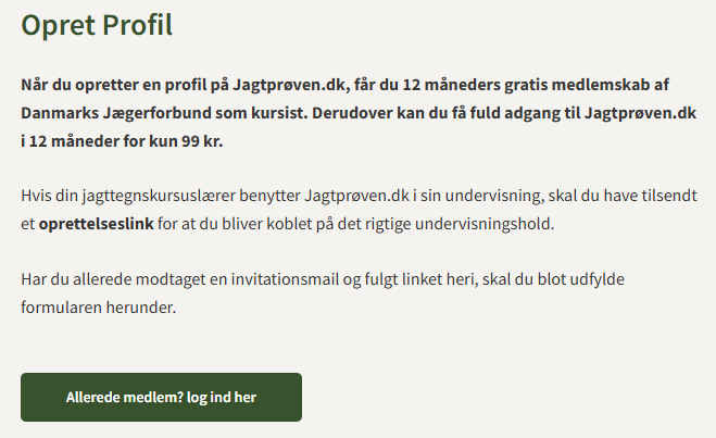 Hvis du er aspirant hos en jagttegnskursuslærer som benytter Jagtprøven.dk i sin undervisning, skal du vente på at din underviser sender dig en e-mail med et link til oprettelse på dit undervisningshold.